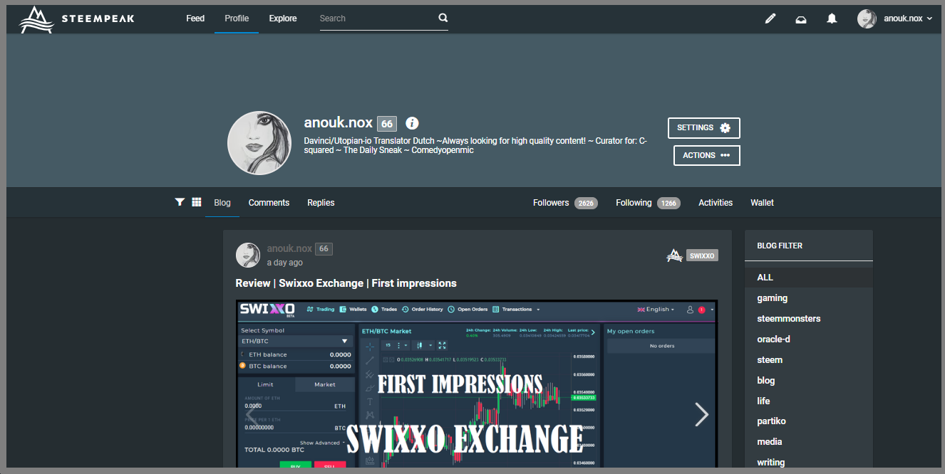 The profile page provides you: your blogs, comments and replies on the left. On the right side you see followers and following, which are pretty clear I think. What I want to share with you in this review, are the two tabs on the right side, namely the activities and wallet tabs. Let's first look at the activities tab: