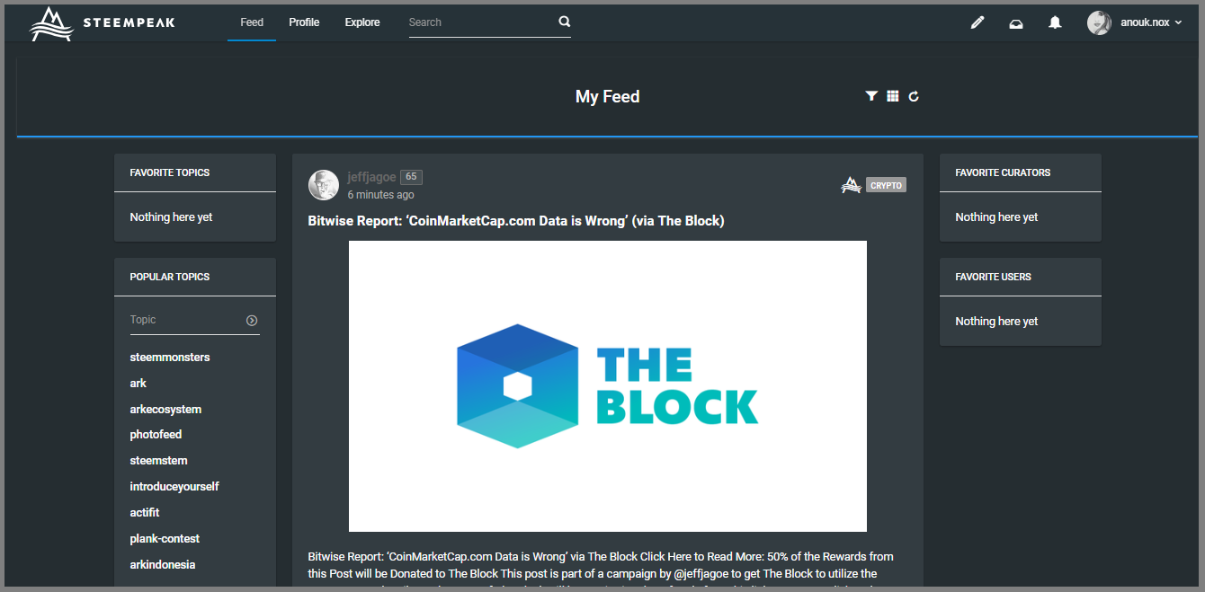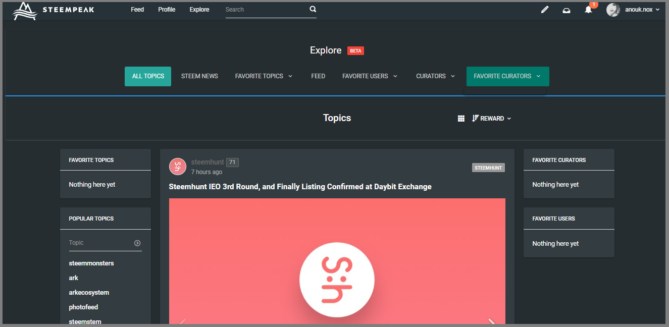 On the first look it seems that the Steempeak feed looks quite similar to the Steemit feed, but that's not quite the case. The biggest difference is that you can add favorite topics, favorite curators and favorite users to your feed. As you can see, I didn't do that yet, but I will start adding these soon for sure, as I love these options! It will help me filter the articles I really love to read from my favorite authors and about my favorite topics.