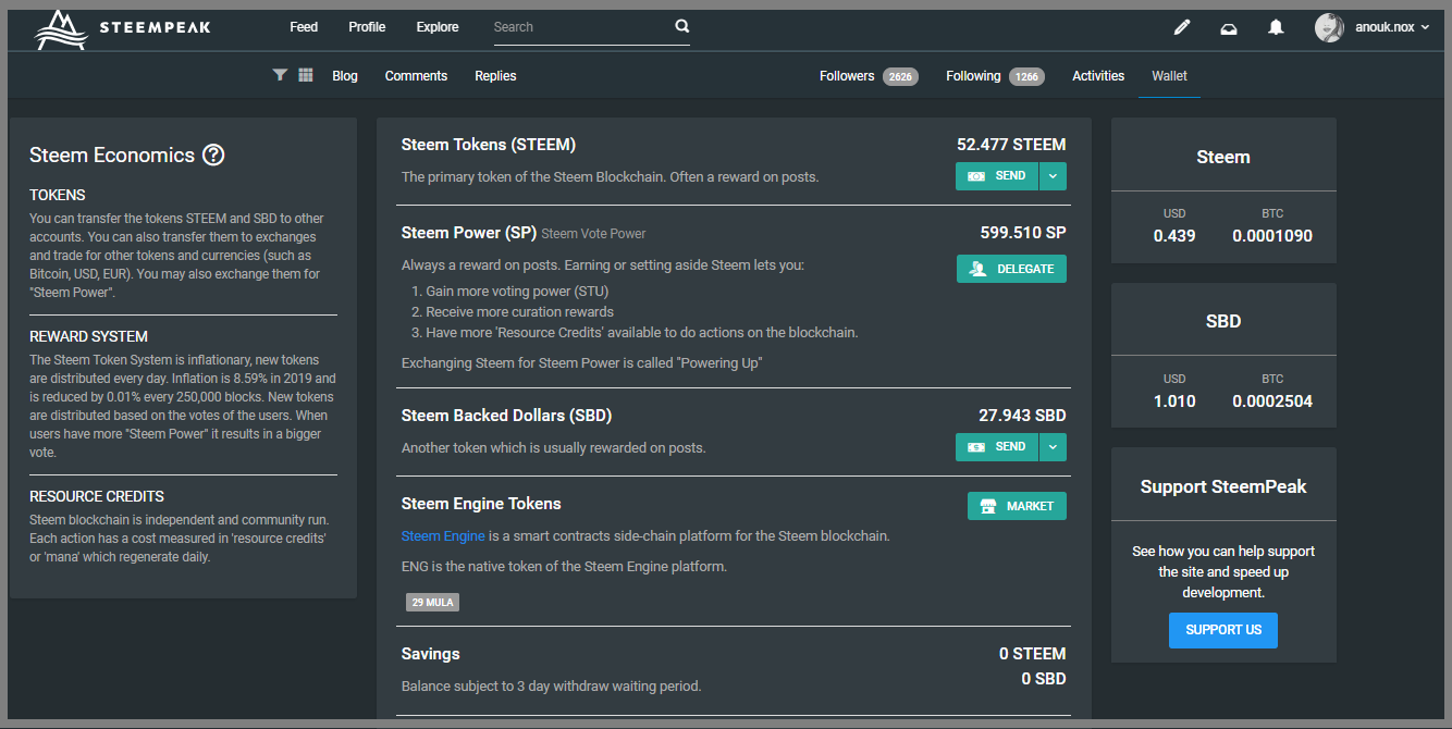 There you have your Steem and Steem Dollars amount, and the option to transfer them to another account. If you look at the Steem Power section, you can see that there's a delegation button. If you click on that, you can easily fill in the account you would like to delegate a part of your Steem Power to, it's easy and speaks for itself. You will also see the Steem Engine tokens market, if you click on that, another page will open from where you can buy and sell Steem Engine tokens.