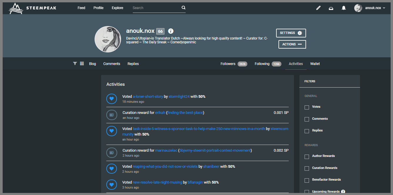 The activities tab shows you the articles you've been voting, the rewards you've claimed etc. You can easily filter them on the right side of the screen by only selecting those activities you want to have a look at. This is a huge advantage when you're looking for a certain transfer for example, as you can now filter everything so you won't have to scroll through all these other transactions in your wallet to find it. Great feature in my opinion!