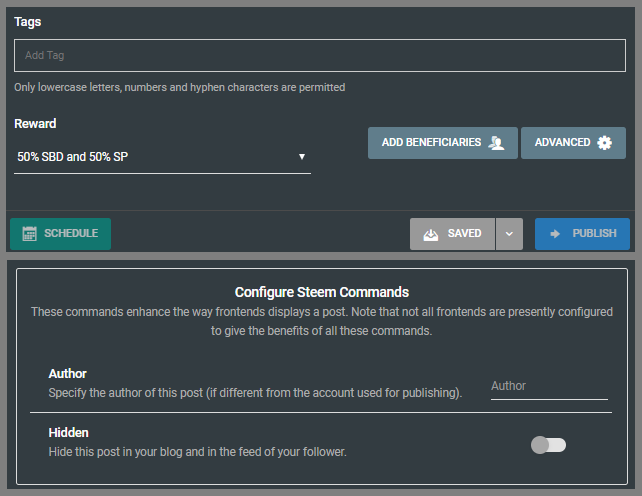 As you can see, you can also choose to add a beneficiary before publishing your article. This can be anyone, not only Steempeak. This is a great feature for when you're doing a fundraiser for example. I love this option! When you click on advanced settings, you will see the option to hide your article in your blog and the feed of your follower. I'm not quite sure yet where this option would be useful for.