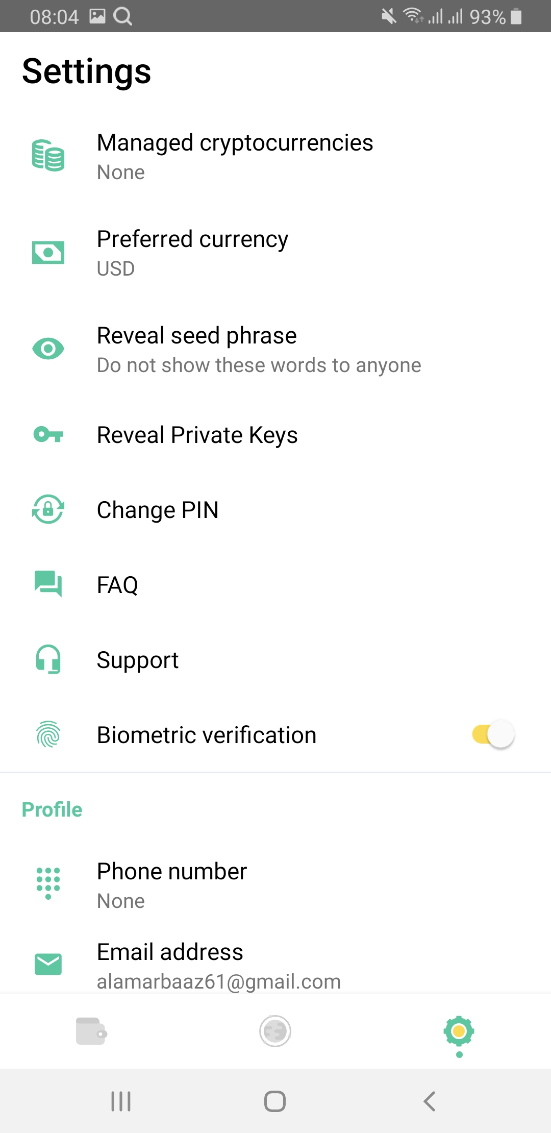 In the second feature of taskbar is to create a account for EOS. So, if you don't have a account of EOS create a new one from Paytomat wallet. As you are seeing picture it is the last part which is setting where you can manage cryptocurrenc, use prefer currency, change pin and also you have Biometric Verification where instead of pin you can use your fingerprint.