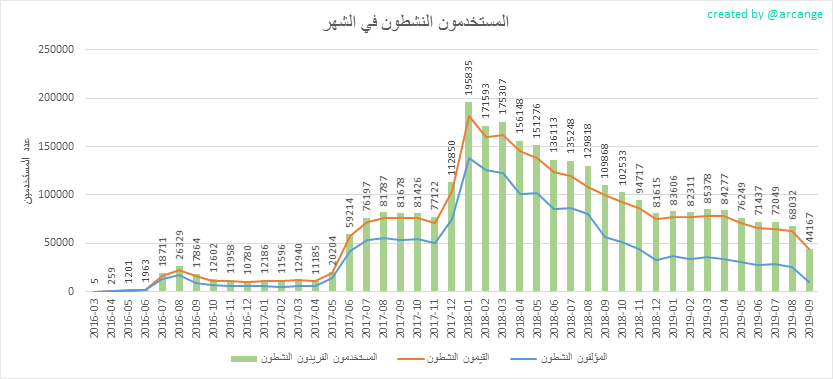 يظهر الخط الأخضر عددهم نشطًا مرة واحدة على الأقل (من قبل المستخدمين النشطين ، أعني أولئك الذين قاموا بنشر مشاركة واحدة على الأقل أو التعليق أو التصويت). يتم تضمينها حتى إذا أصبحت غير نشطة في وقت لاحق.