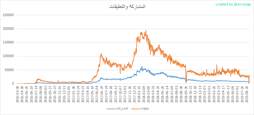 تظهر هذه الرسوم البيانية تطور المشاركات والتعليقات طوال عمر blockchain الكامل ولمدة 30 يومًا.
