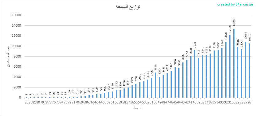 يوضح هذا الرسم البياني توزيع السمعة بين المستخدمين. تمت إزالة حسابات ذات سمعة أقل من 25 للحفاظ على الرسم البياني مقروء.