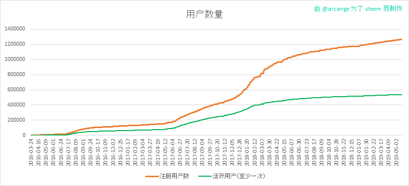 这份图表显示了在 Steem 新注册的用户并且有多少用户是活跃的。我们可以看到有很多的帐号被创建了,但是从来没有被使用过。