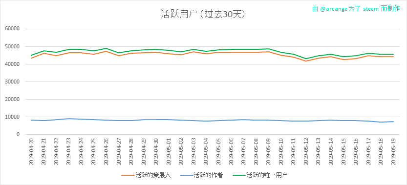 这些数据表显示了最近30天内用户随着时间的活动情况。这里的活跃和上面的定义是一致的。最后面的这张数据图显示了每月的活跃用户数。这可以让我们和 Steem 上的数据甚至是其它社交网络上的数据做比较。