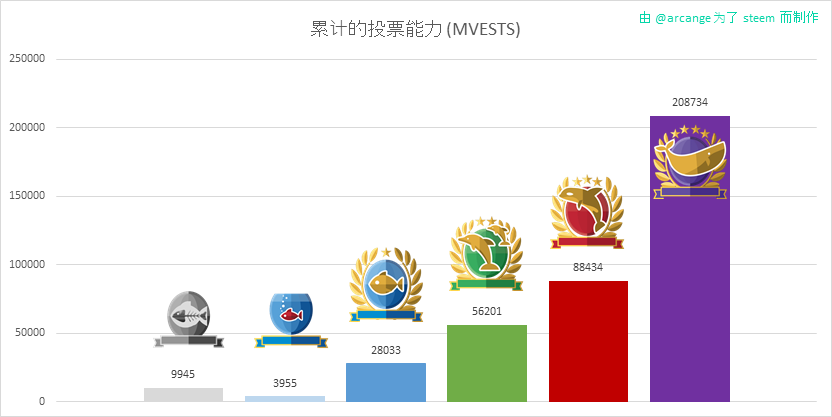这个图表显示了和用户投票能力相关的用户数 (这包括了新注册但未活跃的用户、还有 "Red Fish"级别,请查看 @steemitboard 了解更多的信息)
