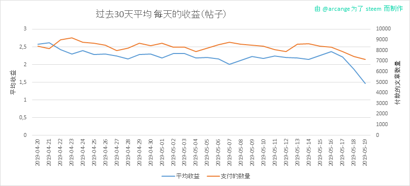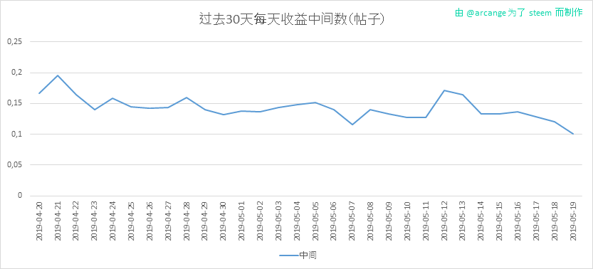 这个图表显示了每一天(整个区块链和过去30天)内在一篇帖子(或者评论)上的最大奖励(收益)