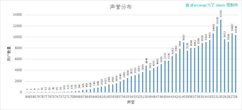 这个图表显示了声誉被用户平分的情况。为了让图表更具有可读性,我们把低于25级的用户从数据中移除了。