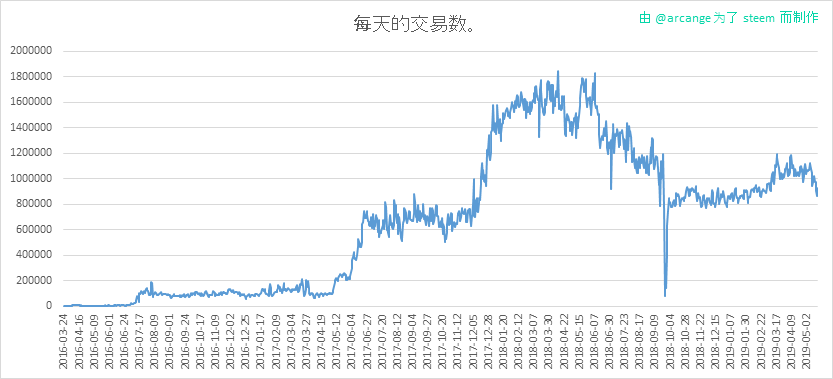 这个图表显示了每天的交易数。我们可以了解到整个区块链上的活动。
