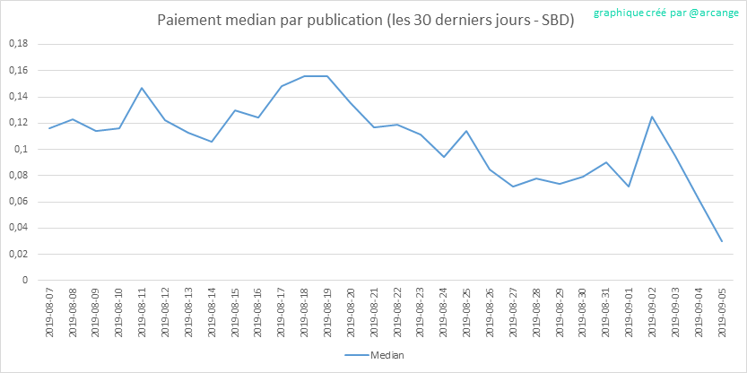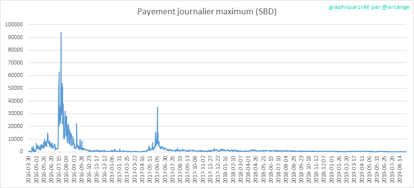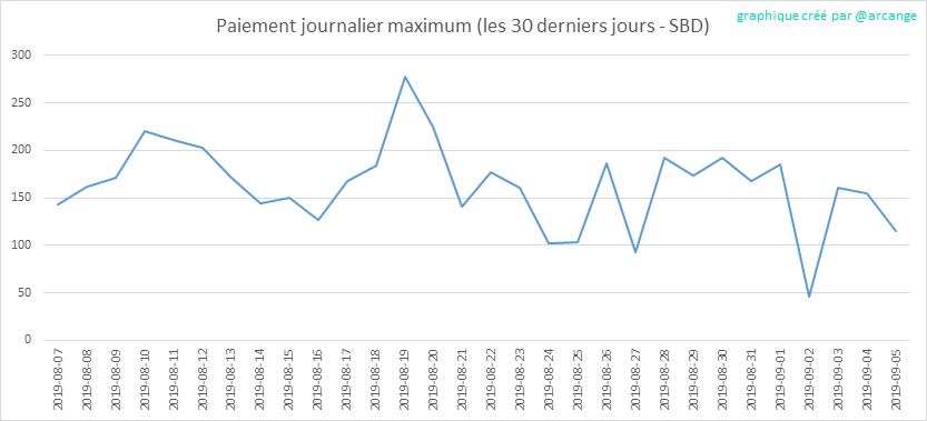 Ces graphiques montrent la récompense maximale payée sur un message (ou un commentaire) pour chaque jour (depuis la création de la blockchain et les 30 derniers jours).