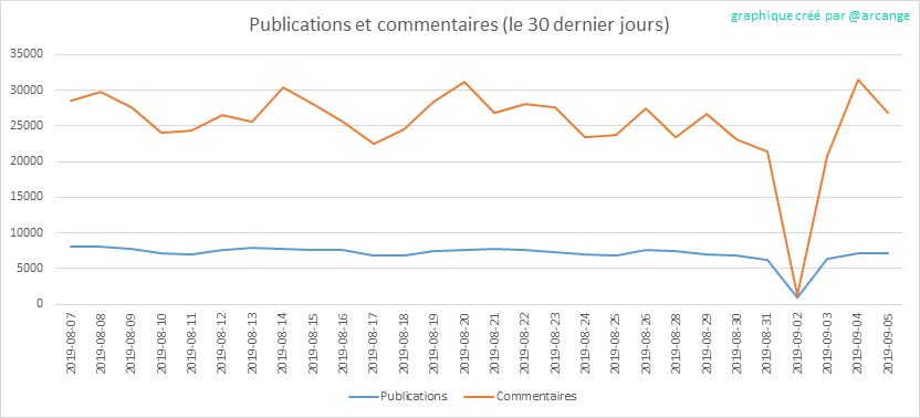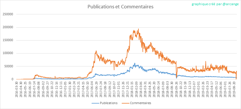 Ces graphiques montrent l'évolution des publications et des commentaires pour toute la durée de vie de la blockchain et pour les 30 derniers jours.