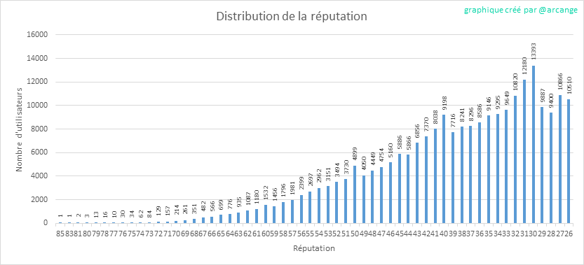 Ce graphique montre la répartition de la réputation entre les utilisateurs. Les comptes dont la réputation est inférieure à 25 ont été supprimés pour que le graphique reste lisible.