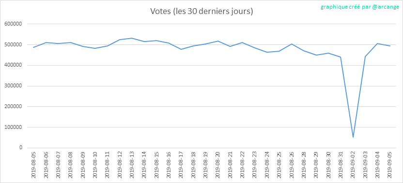 Ces graphiques montrent l'évolution de la curation (votes positifs) depuis la création de la blockchain et pour les 30 derniers jours.