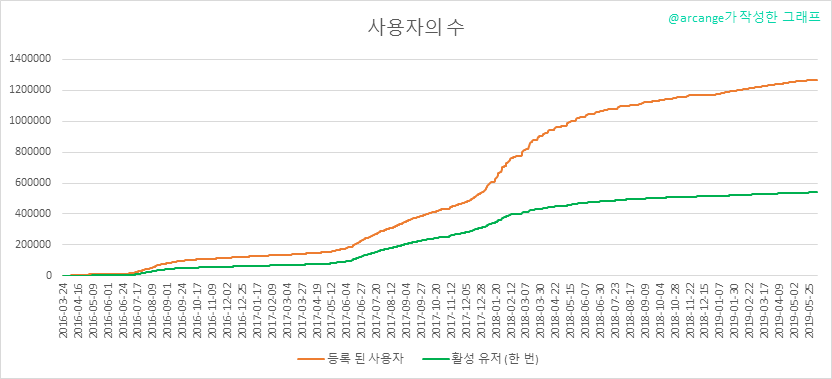 이 그래프에서 주황선은 전체 가입한 계정의 수를 보여줍니다.