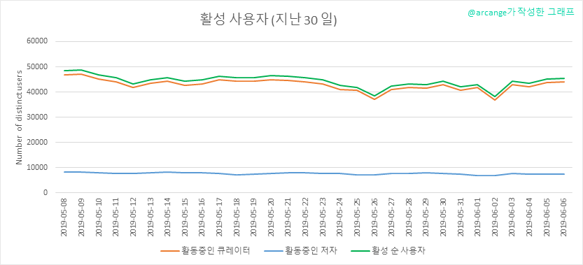녹색선은 그 중 얼마나 많은 계정이 한번이라도 활성화 되었는지 나타냅니다. (활성화는 단 한번이라도 글, 댓글 또는 업보트를 한 계정을 말합니다.) 그들은 그들이 나중에 비활성화 될 경우에도 포함되어 있습니다.