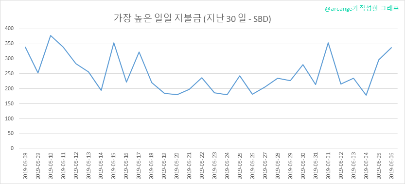 위의 그래프들은 지난 30일간 게시글당 평균 보상 금액과 중앙값(median payout)을 보여줍니다.
