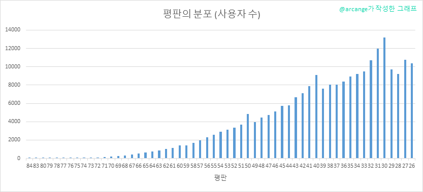 이 그래프는 평판 수치에 따른 유저들의 분포도를 보여줍니다. 25 이하의 평판을 가진 유저들은 그래프에서 제거되었습니다.