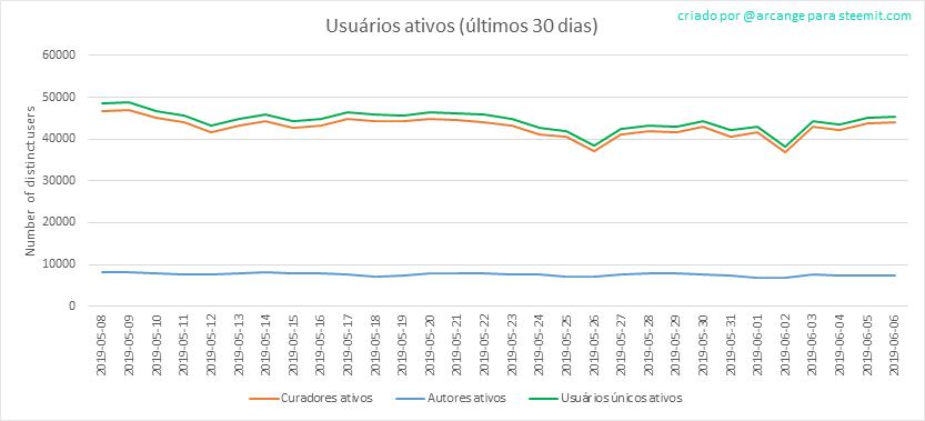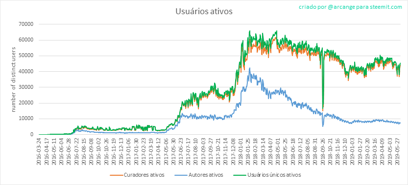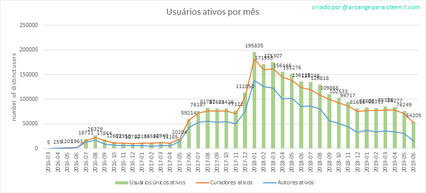 O último gráfico é um resultado mensal dos usuários ativos. Isso permite comparar o valor do blockchain Steem para aqueles que costumam postar em outras redes sociais.