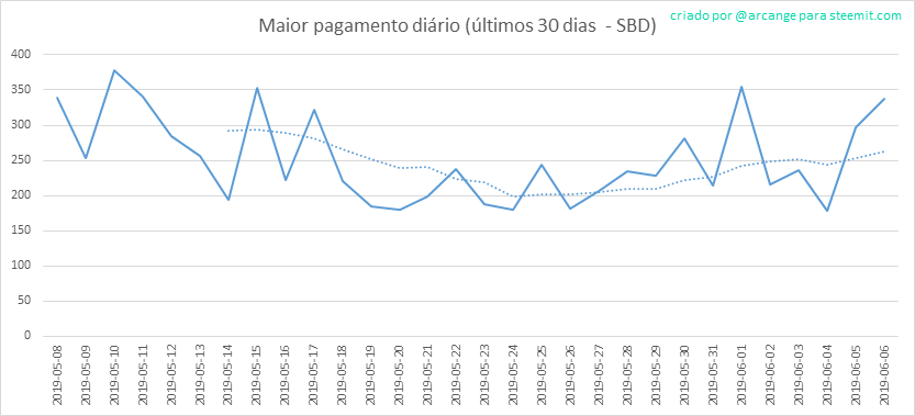 Este gráfico mostra o máximo de recompensa pago por um post (ou comentário), em cada dia (durante todo funcionamento da blockchain e os últimos 30 dias)