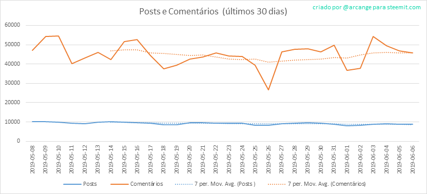 Esses gráficos mostram a evolução dos posts e comentários desde o início da blockchain e dos últimos 30 dias.