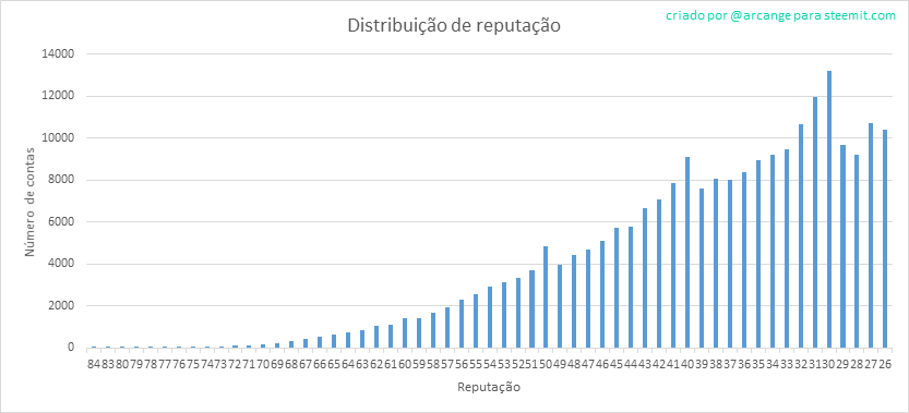 Este gráfico mostra a distribuição de reputação entre os usuários. Contas com reputação menor que 25 foram removidas do gráfico para melhor visualização.