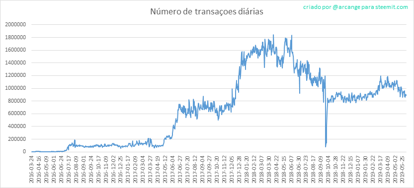 Este gráfico mostra o número de transações diárias. Isto dá uma ideia de toda atividade na blockchain.