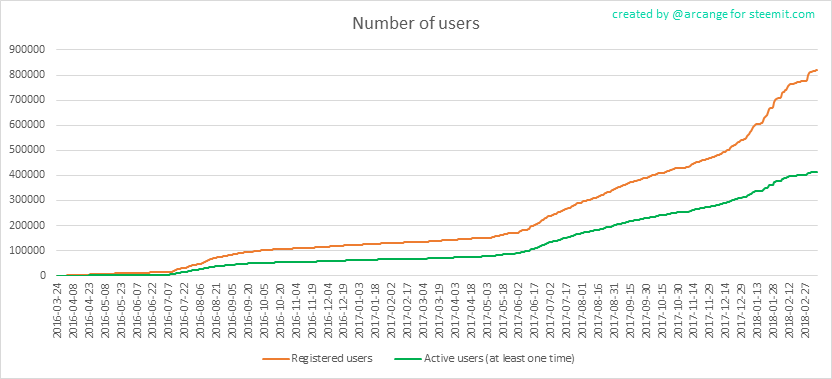 This chart shows the number of newly registered users on Steemit and how many of them became active. We see that a lot of accounts are registered, but never used.