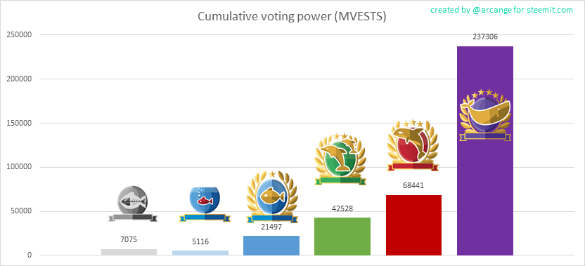 This graph shows the number of users according to their voting power (it now includes the new "Inactive" and "Red Fish" levels - check @steemitboard blog for more info about this).