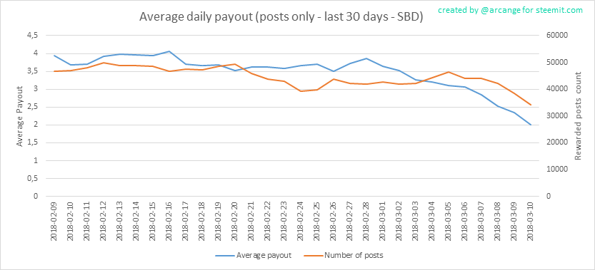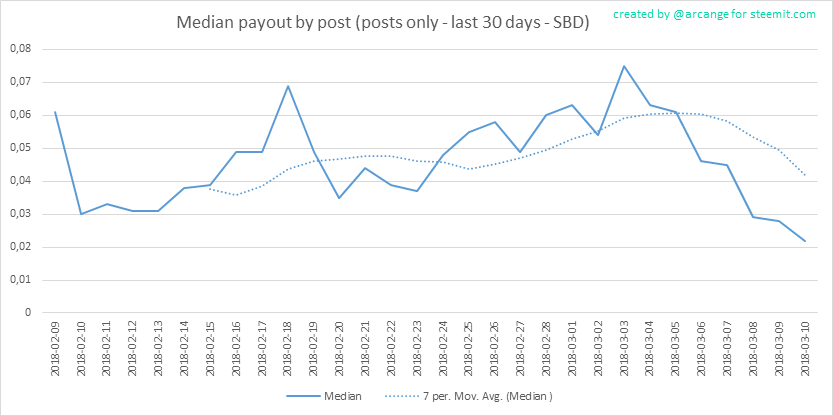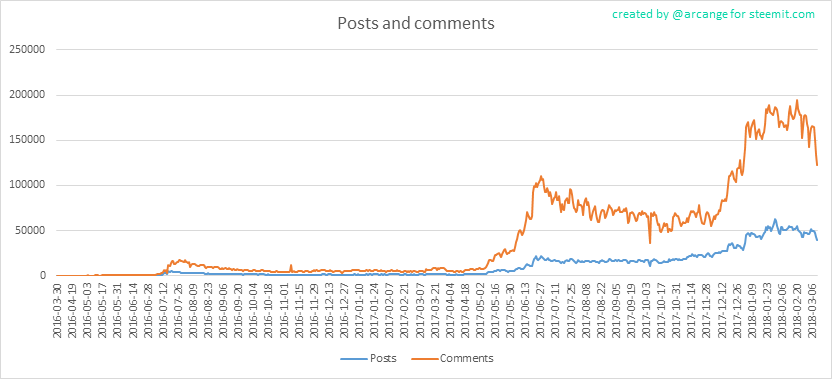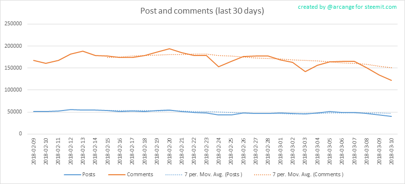 These graphs show the evolution of posts and comments for the whole blockchain lifetime and for the last 30 days.