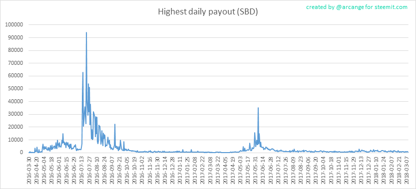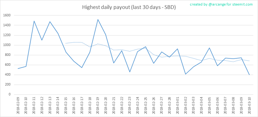 These graphs show the maximum reward paid on a post (or comment) for each day (whole blockchain life and last 30 days).