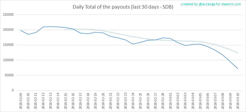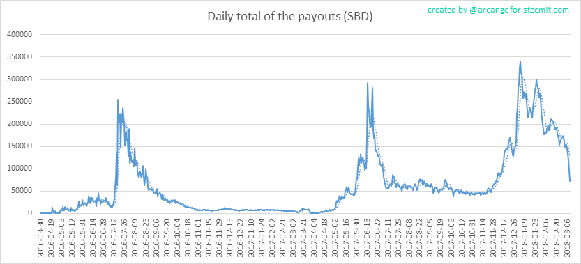 These graphs show the total of the distributed payout (posts and comments) for each day.