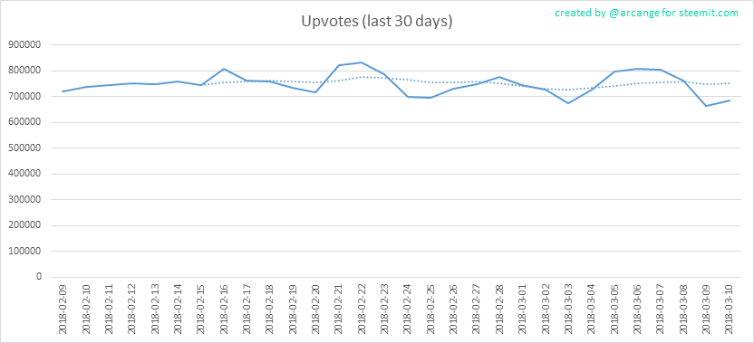 These graphs show the evolution of curation (upvotes) for the whole blockchain lifetime and for the last 30 days.