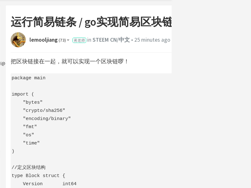 Follow me to vote @lemooljiang-运行简易链条 / go实现简易区块链 #2