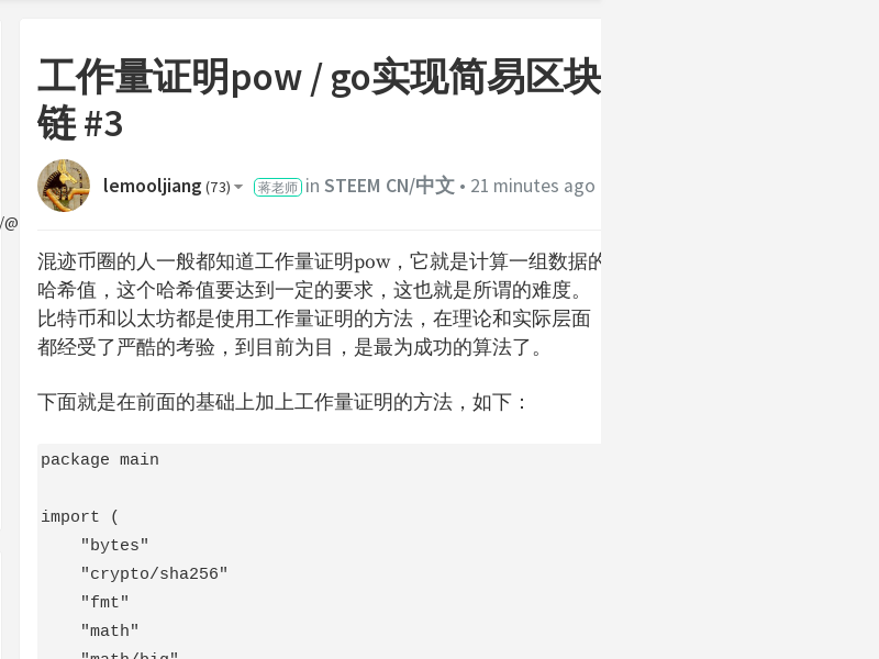 Follow me to vote @lemooljiang-工作量证明pow / go实现简易区块链 #3
