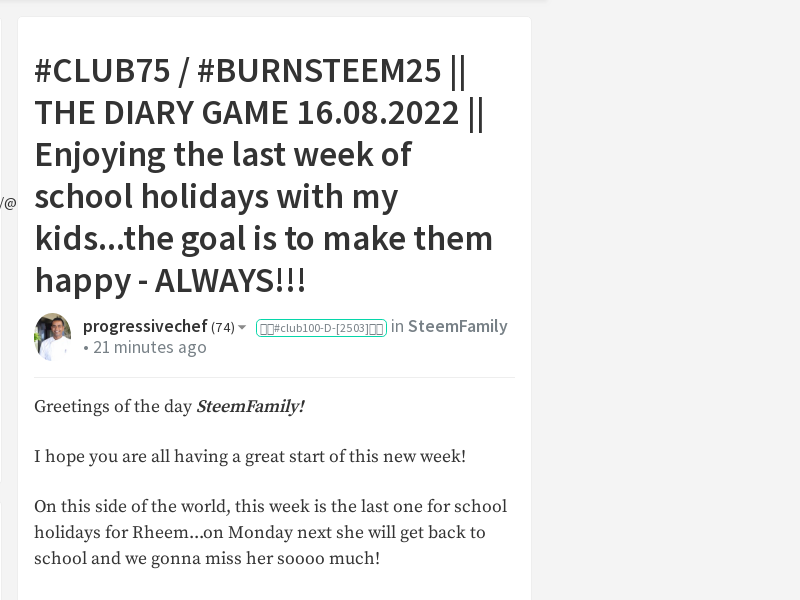 Title:#CLUB75 / #BURNSTEEM25 || THE DIARY GAME 16.08.2022 || Enjoying the last week of school holidays with my kids...the goal is to make them happy - ALWAYS!!!