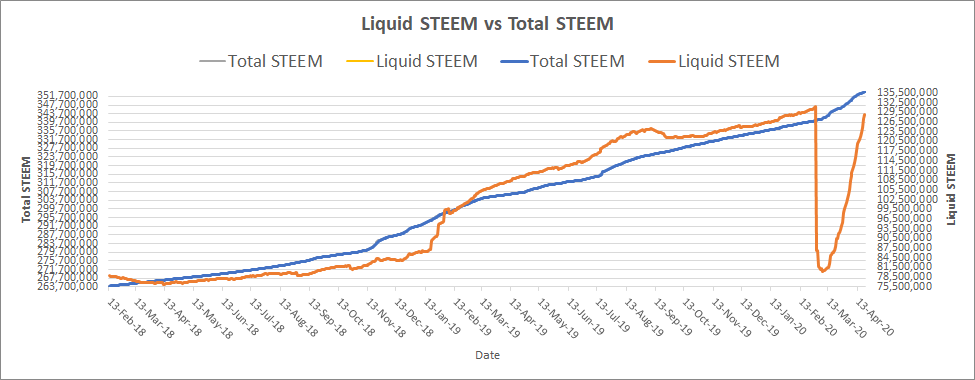 This is a historical graph of both Total STEEM and Liquid STEEM supply