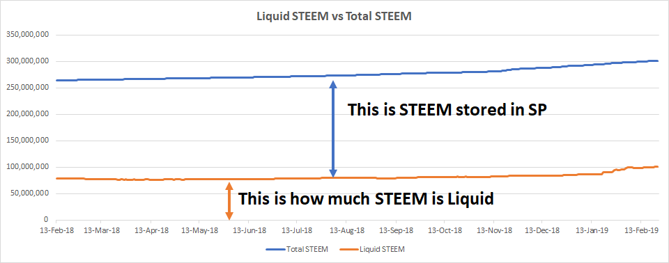 This is a historical graph of both Total STEEM and Liquid STEEM supply