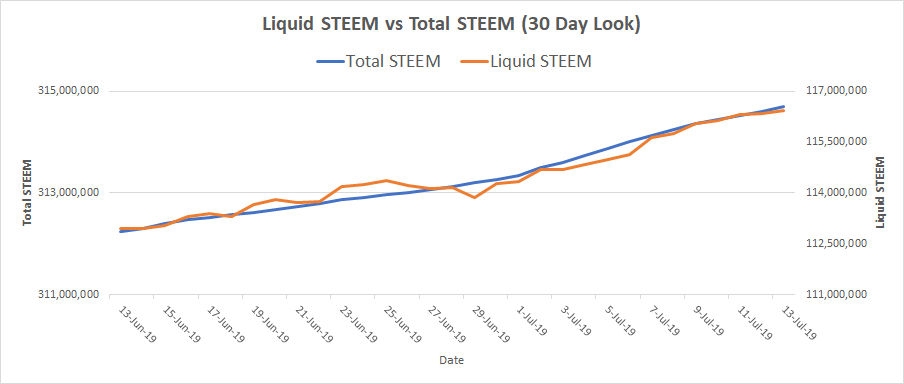 This is a historical graph of both Total STEEM and Liquid STEEM supply