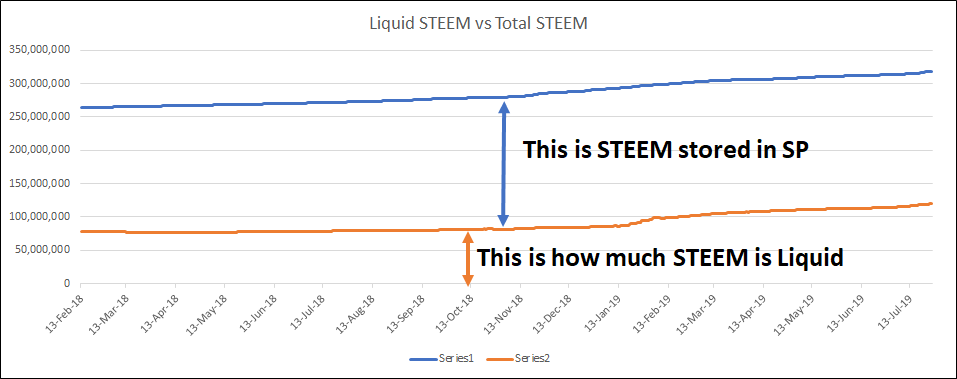This is a graph of the same data. The data of this graph was plotted on the same scale to show the massive difference between Liquid STEEM and STEEM stored in SP