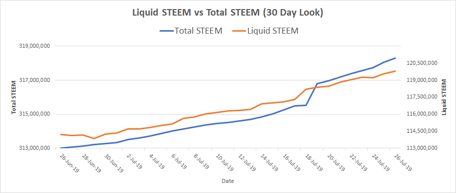This is a historical graph of both Total STEEM and Liquid STEEM supply