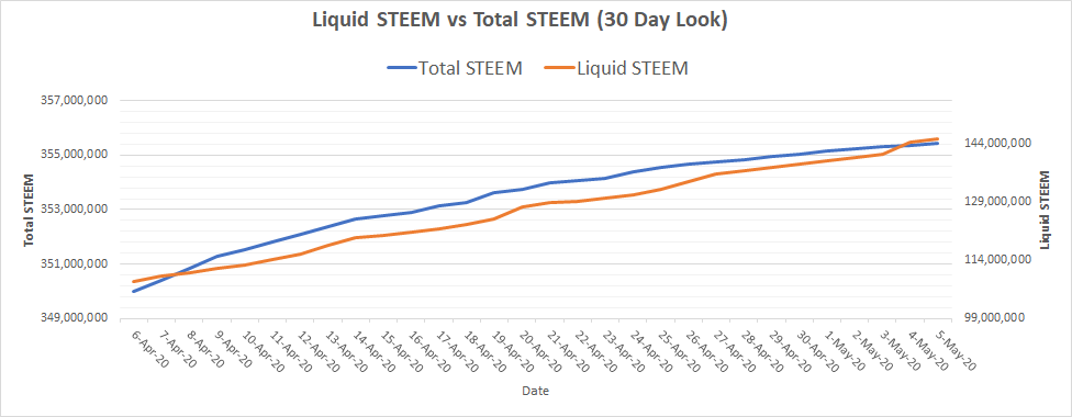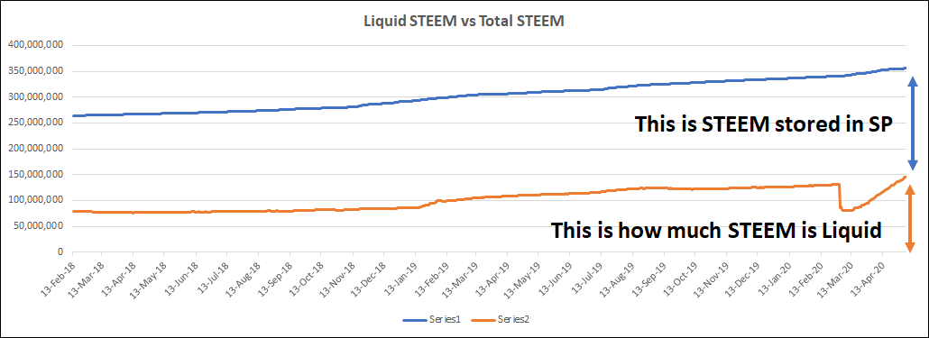 This is a historical graph of both Total STEEM and Liquid STEEM supply
