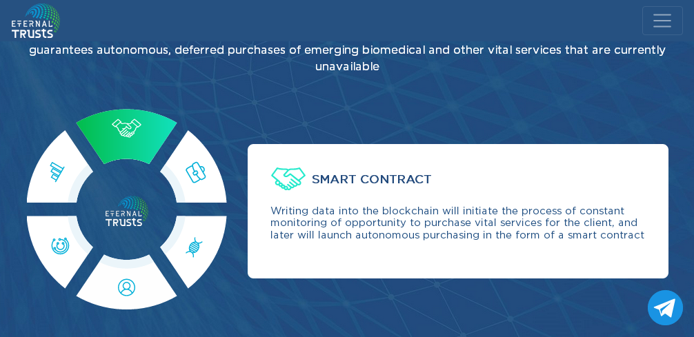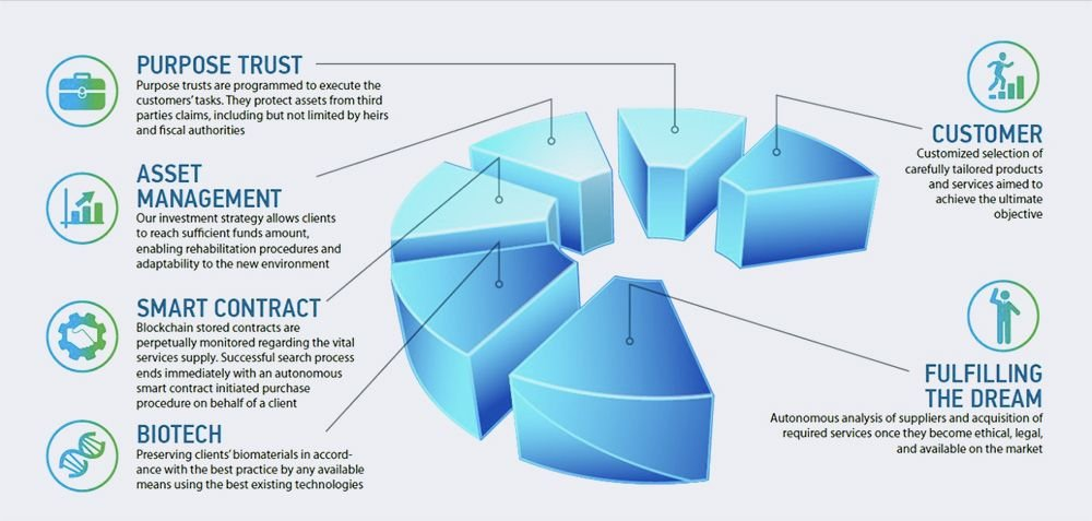 Eternal Trusts is a blockchain platform for future pending technology purchases. There are over 16 million millionaires in the world today, and at least 10% of them will be eager to try anything that might radically prolong their lives and improve their standard of living. However, no matter how many people are willing to pay, you are still prohibited from purchasing services that have not been approved by the regulator, inaccessible due to legislative inability, or requiring additional research. We provide solutions to this problem by creating platforms where individuals can formulate the products and services necessary for their well-being, where research groups can analyze potential demand for their latest developments, and finally: