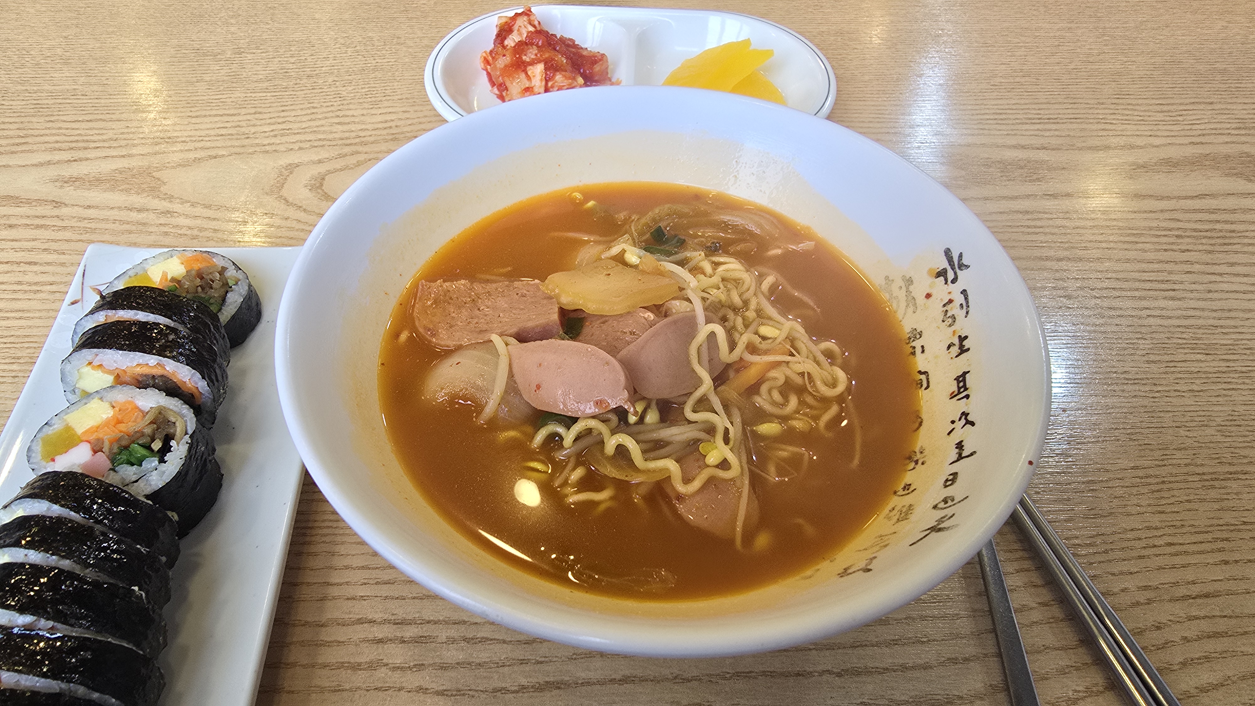 라면은 김치와 소세지가 들어가 구수한 부대찌개 느낌이고 김밥도 내용이 실해서 만족스러웠다.