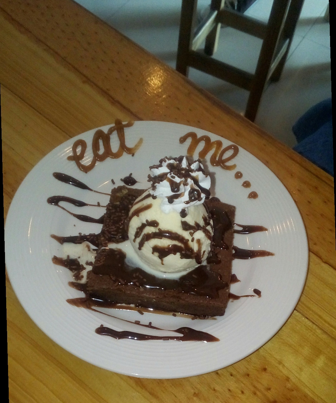 Participaré con la foto de un brownie con una copa de helado de mantecado, acompañando de suspiró de crema blanca como toque final, cubierto con sirope de chocolate y un toque especial con arequipe en las letras eat me.