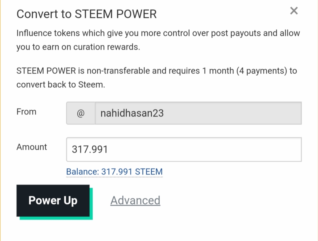 - আপনার wallet এ যত SBD (STEEM DOLLARS) আছে সেটা steem এ রুপান্তর করুন এবং power up করুন। ১ SBD অথবা ১ Steem থাকলে তাও power up করুন। কারণ বিন্দু বিন্দু পানি দিয়েই সমুদ্র তৈরি হয় । Power Up কিভাবে করতে হয় জানতে এখানে ক্লিক করুন power up এর প্রক্রিয়া