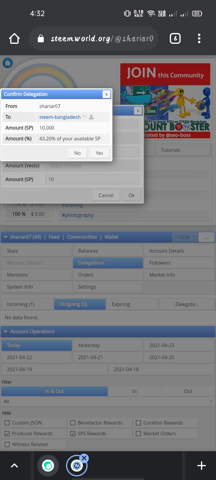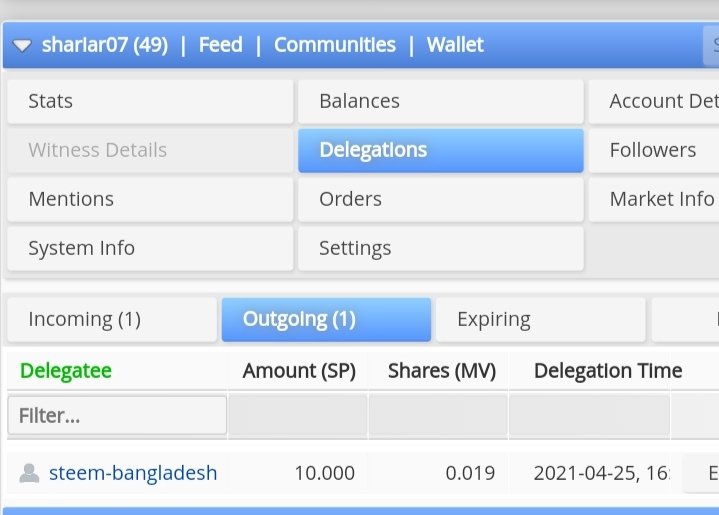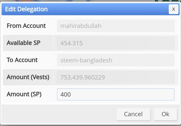 আপনারা আপনাদের wallet এ ১৫ sp রেখে বাকি পুরো Steem power @steem-bangladesh কমিউনিটি একাউন্টে Delegation করুন (মনে করুন আপনার ১০০ Steem power রয়েছে তাহলে আপনি আমাদের (১০০-১৫= ৮৫) Steem delecate করবেন)। কিভাবে Deligation করতে হয় জানতে এখানে ক্লিক করুন Delegation এর প্রক্রিয়া