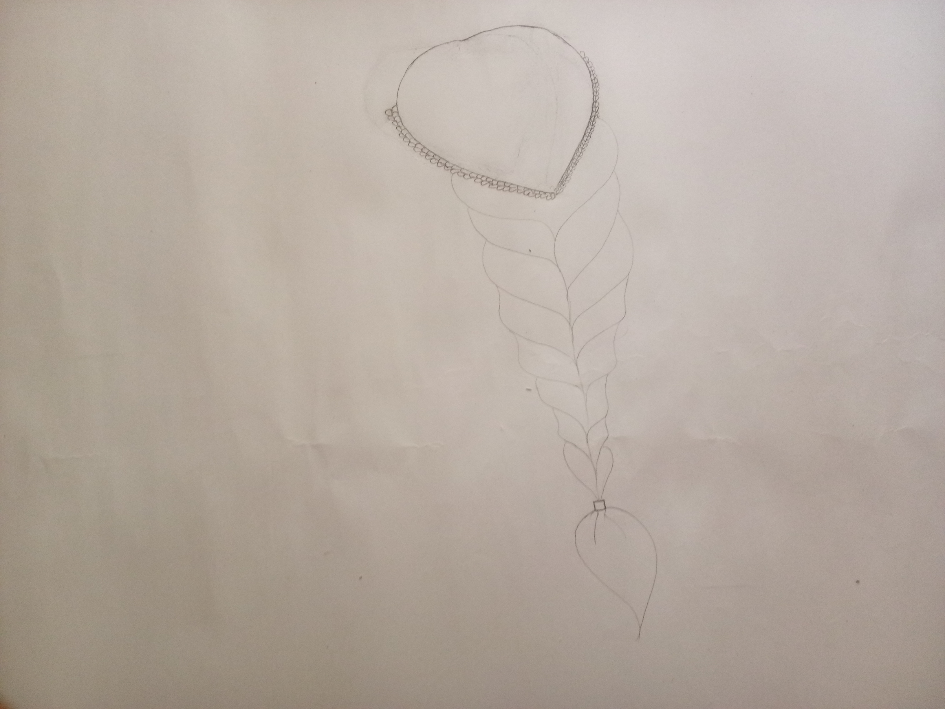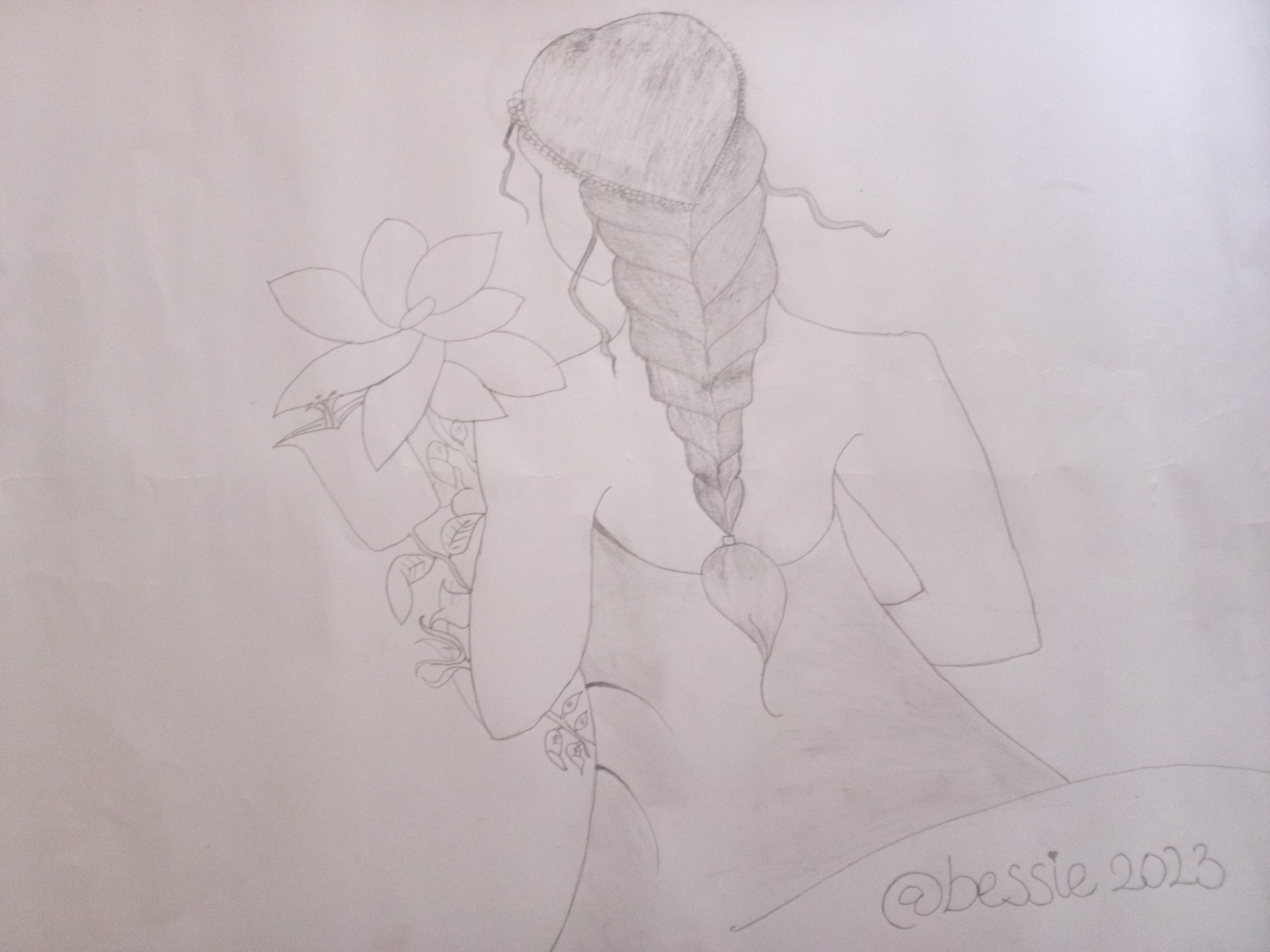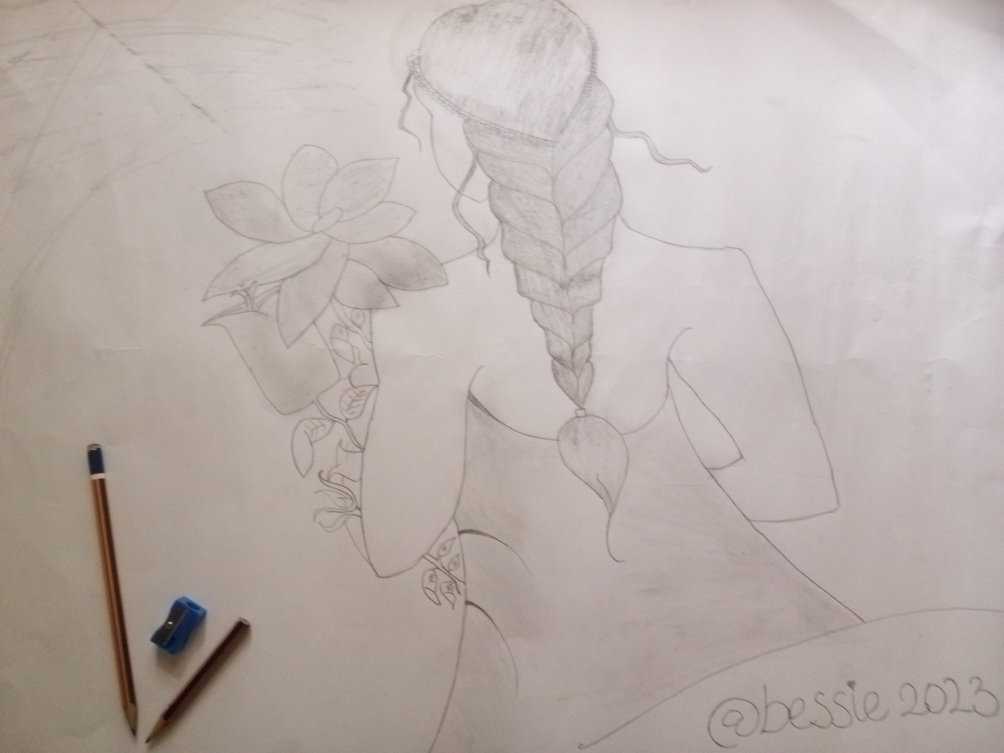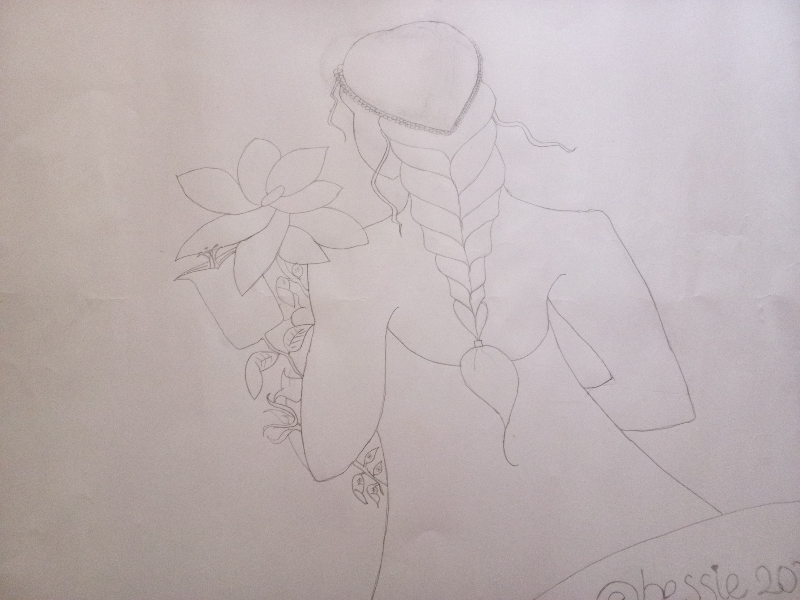 I prepare my drawing materials, taking the next step i drew a love shape and label the flowers around the line of the love shape, then after that still draw a love shape in the under of flower shape as hair , draw the face, shoulder and put the back line then the flowers, note the hand wasn't full it was half , then go ahead to shade the hair part of the drawing, the gown and the flowers part. Hope you understand the procedure.