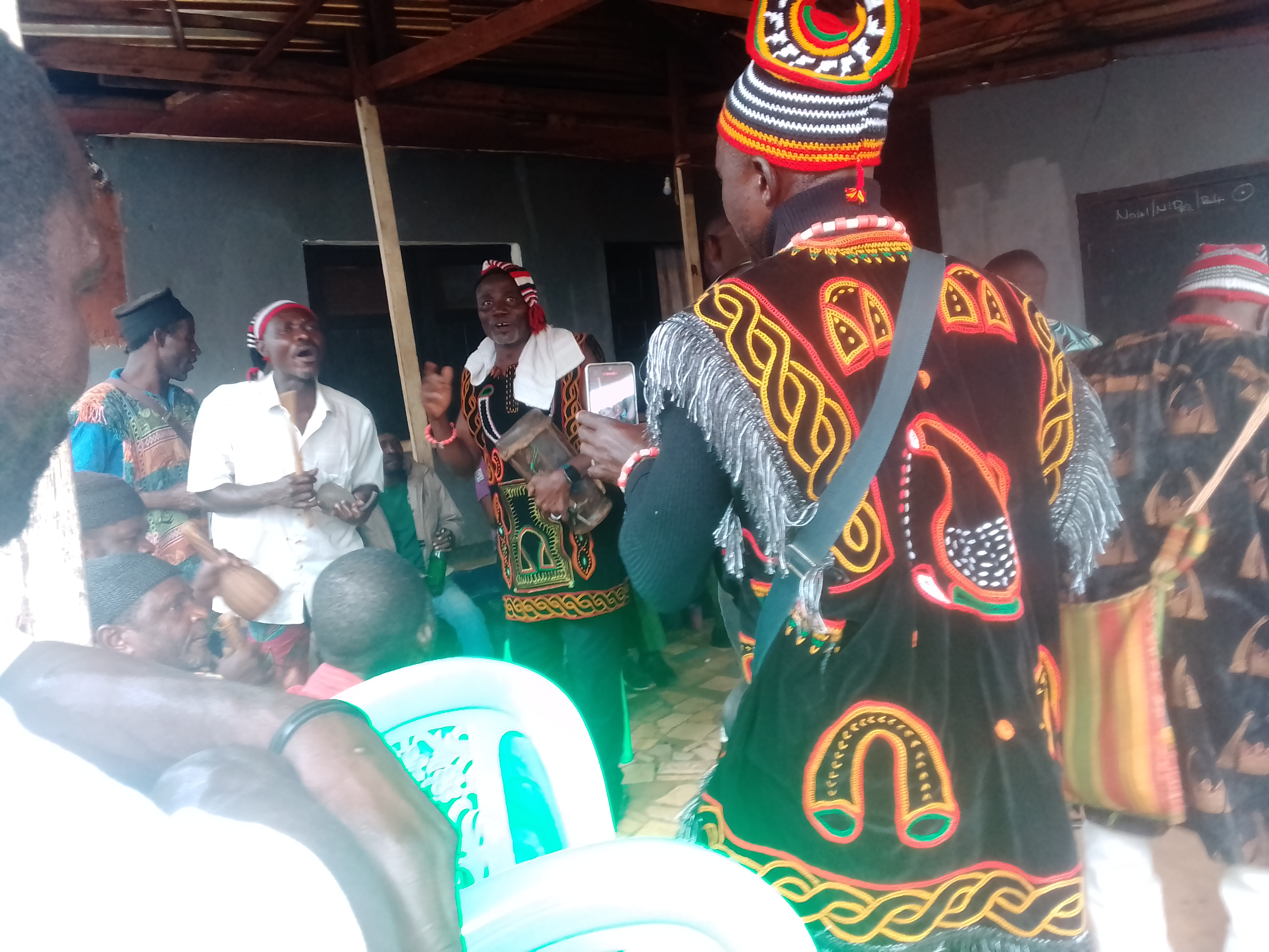 For those without any traditional portfolio or office or authority, wear simple caps mostly black caps or the ones made by fibre thread ( thread extracted from the young Raphia palm trees ). Caps usually symbolize maturity in a highly stratefied society. What each person wears indicates one physical level. For the youth most of those who have traditional titles or positions, it is for the fun, and love of all Culture